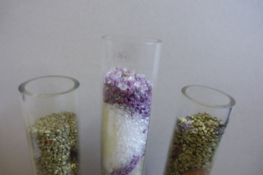 V njih je pesek, notranji premer je tak kot so čajne svečke, zgoraj so bile čajne svečke tudi postavljene. Skupni premer 5 cm.