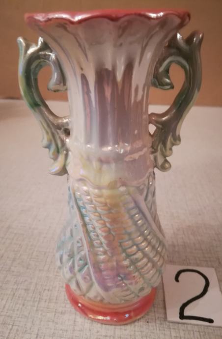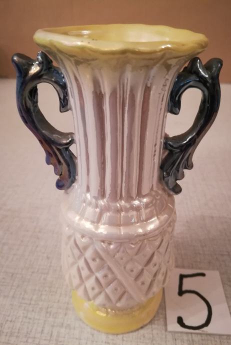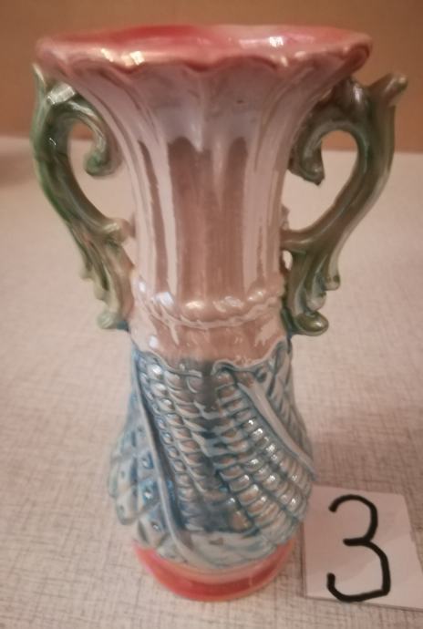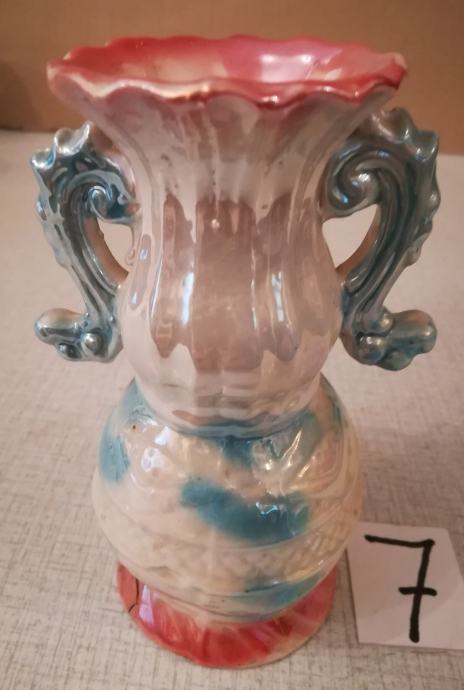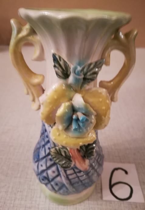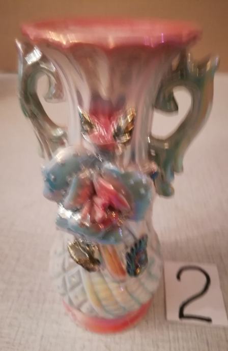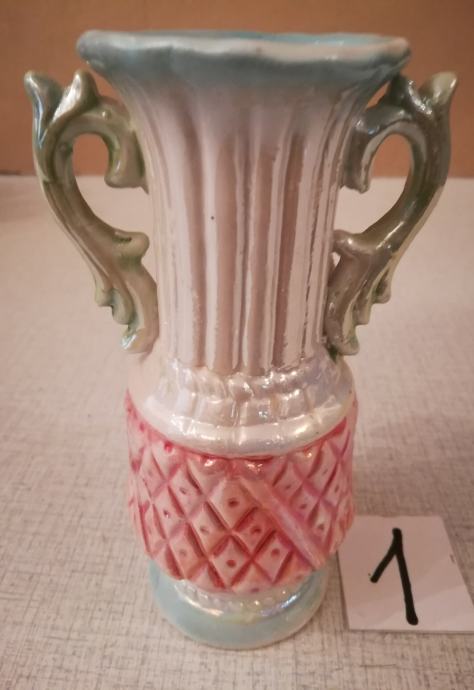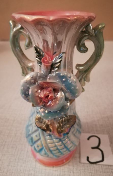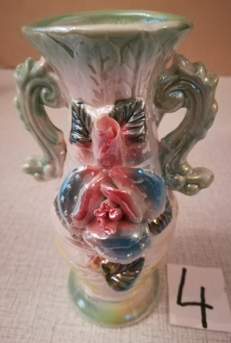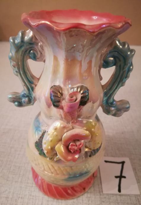 1,2,3,4,5,6,7 vaze iz porcelana z dvema ročajema in vrtnico na sredini vaze. Vaze so različne in se razlikujejo po poslikavi z različnimi odtenki barv. Mere vaz : višina 14 cm in širina 6 cm. Cena 5€/kom.