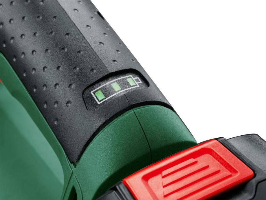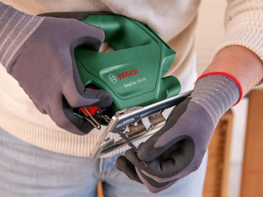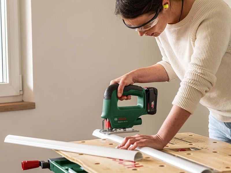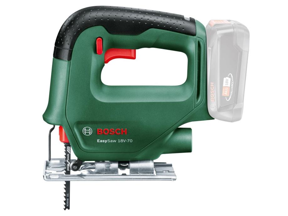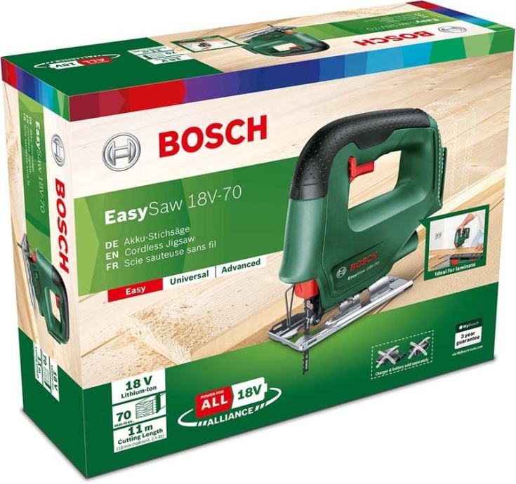 Akumulatorska vbodna žaga Bosch EasySaw 18V-70 Solo je primerna za preprosto žaganje lesa, umetne mase in kovine. Lahka vbodna žaga omogoča globino reza največ 70 mm v les in 6 mm v kovino. Zaradi tega je idealen pomočnik za hobi in domače projekte, ki vam pomaga, na primer, pri žaganju polic, pohištvenih desk ali laminatnih talnih oblog.Preprosto upravljanje s samo enim stikalomMajhno vbodno žago lahko preprosto upravljate z enim samim stikalom. Primerna je tako za ravne kot ukrivljene reze. Spremenljivi nadzor hitrosti in mehak zagon ponujata najboljšo kombinacijo udobja in kakovosti rezanja. S hitrostjo gibov v prostem teku 2600/min (gibi) lahko dosežete izredno natančne reze.Funkcija pihanja in zajeralni reziVgrajena funkcija pihanja vedno zagotavlja najboljši pogled na linijo reza, tako da lahko delate s posebno natančnostjo. S priključkom za sesalnik boste delovno območje vedno ohranili čisto. Zahvaljujoč vrtljivi jekleni osnovni plošči je nagib žage možno nastaviti do kota 45°. Lahka vbodna žaga s preprosto menjavo lista Kompaktna oblika in izjemno majhna teža le 1,3 kg nudita udobno rokovanje. Žagin list je mogoče zamenjati preprosto, hitro in brez orodja zahvaljujoč izboljšanemu sistemu SDS. Tako je menjava lista tudi za začetnike povsem preprosta.Bosch Power for All: Sistem naprav Home & GardenBosch akumulatorska žaga EasySaw spada v sistem naprav Home & Garden. To pomeni, da lahko s samo eno baterijo napajate več naprav. Če ste že lastnik ene od naprav iz sistema Bosch Home & Garden zmogljivostnega razreda 18 V, ne rabite kupiti dodatnega akumulatorja.Komplet vključuje 1 žagin list Bosch T 144 D. Akumulator in polnilnika sta na voljo posebej.