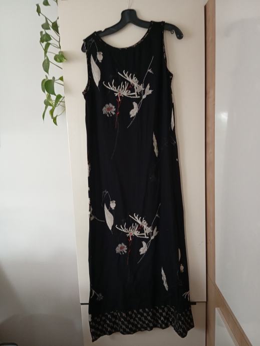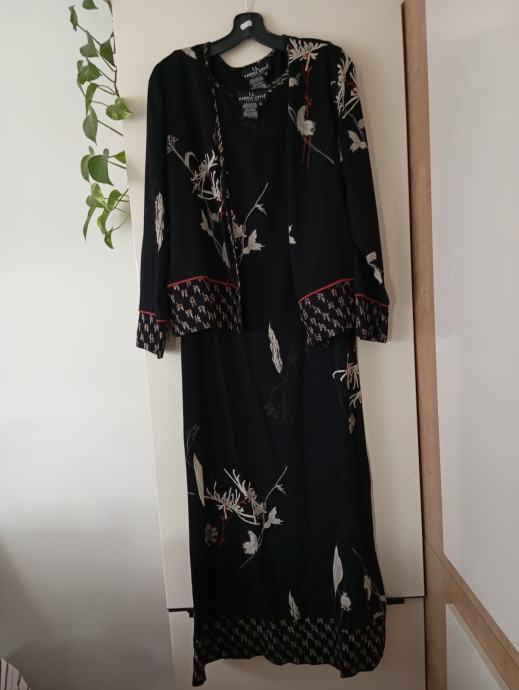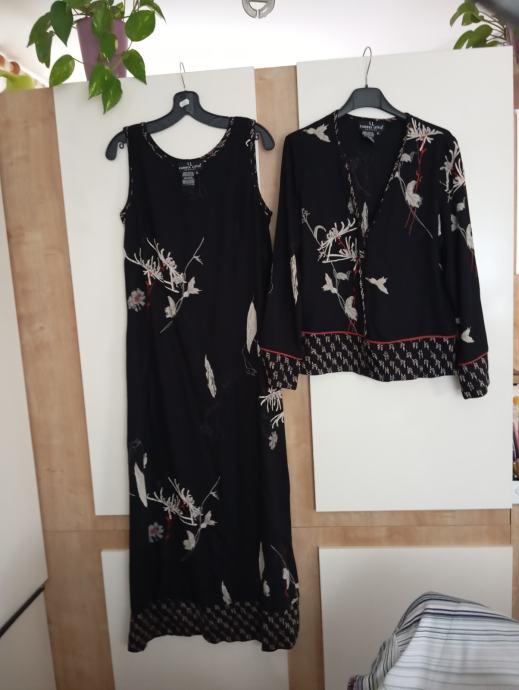 Nova, višji cenovni razred, kvalitetna, 100% rayon (viskoza), ni podložen, ni raztegljiv, obleka meri od ene pazduhe do druge 48cm, dolžina je 135cm, suknjič meri od ene pazduhe do druge 50cm, dolžina je 60cm, ne menjam, ptt ni vključena v ceno