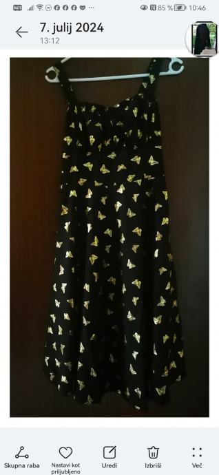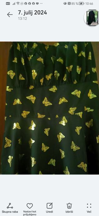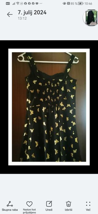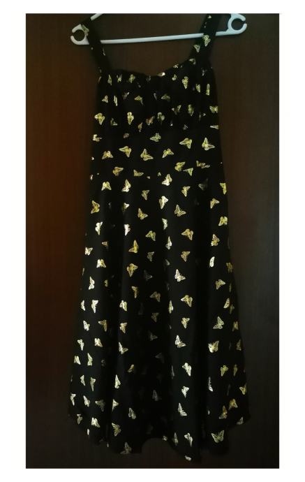 Čudovita nova črna obleka A kroja, okrašena z zlatimi metuljčki. Označena velikost je S, primerna je za velikosti XS, S in SM. Elegantna izbira za večerne priložnosti, ki bo poskrbela za modni vtis. Obleka je lahkega kroja in primerna tako za poletne dogodke kot tudi bolj formalne priložnosti.