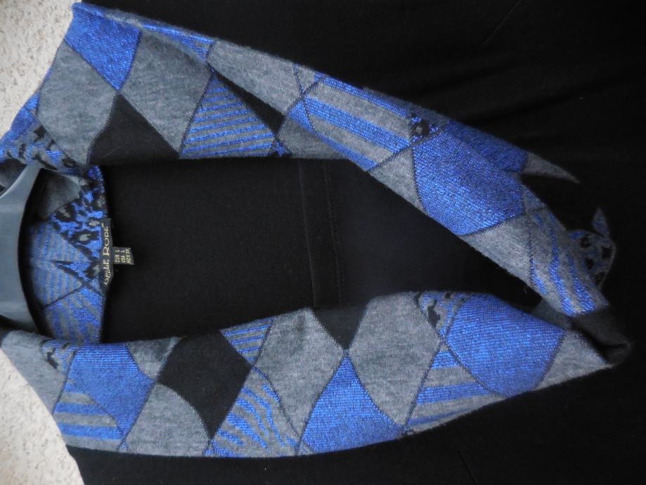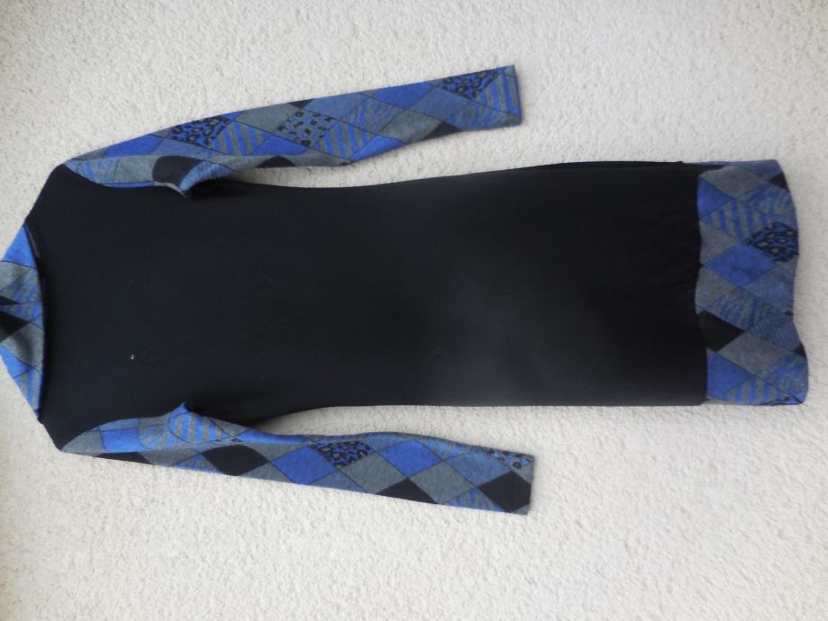 Nova, zelo kvalitetna in kompaktna, raztegljiva, ni podložena, modri del obleke je rahlo svetleč. Dolžina obleke je do kolen.
