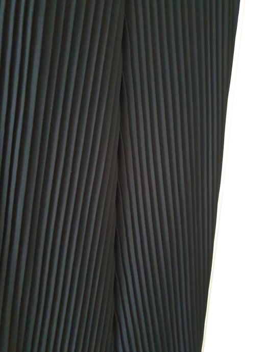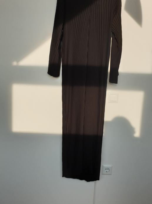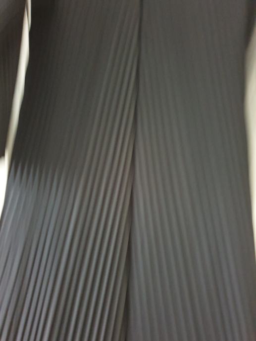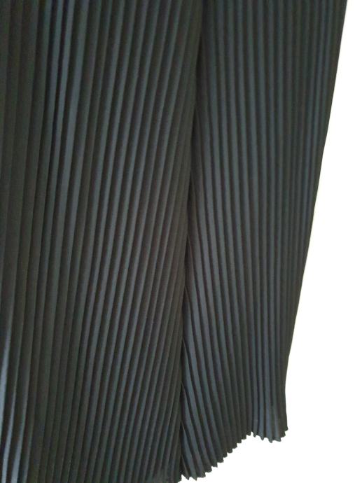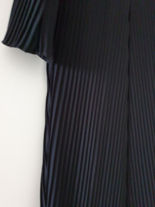 Obleka ni bila nikoli uporabljena, ima dolga široka plise rokava, je lahka za vzdrževanje in se ne mečka. Dolžina 141 cm, zaradi modela in raztegljivega pliseja je primerna tako za velikosti M kot tudi S. Nosi se s pasom ali brez. Kupljena v tujini.