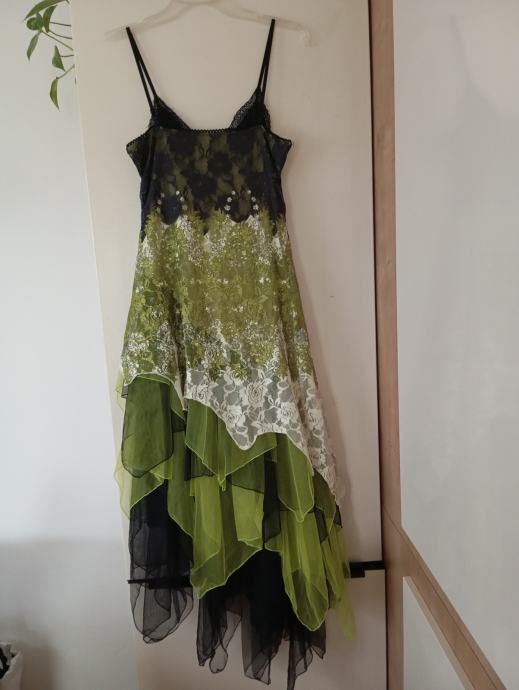 Nošena samo 1x za posebno priložnost, podložena, delno raztegljiva. Od ene pazduhe do druge meri 39 do cca 46cm, dolžina je 140cm, ima nastavljive naramnice. Orig. oznaka vel. je M