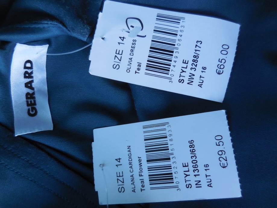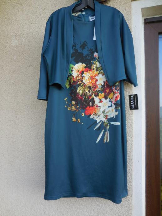 Čudovit nov komplet obleke in jakne v turkizno zeleni barvi s cvetličnim potiskom na sprednji in zadnji strani obleke. Je podložena s tenko podlogo in je raztegljiva, dolžina je do kolena, zapenja se zadaj z dolgo zadrgo.