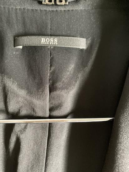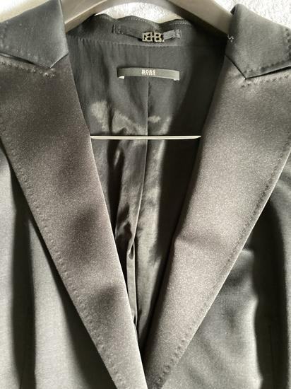 Hugo Boss smoking kostim, št 42-44, PC1250€, lepe črne barve, primeren za vse pa tudi za luksuzne priložnosti, ovrtanik in hlače imajo svileno blago, kar naredi kostim izjemen. Vrhunski material volna in elastan, ter zares lepo izdelan in krojen hlačni kostim. Nošen 1 x .