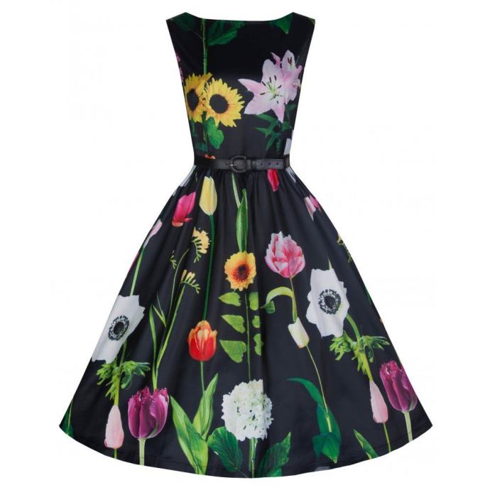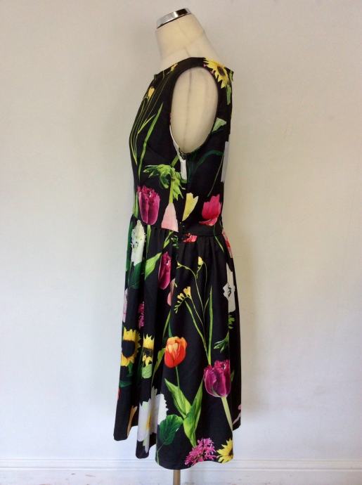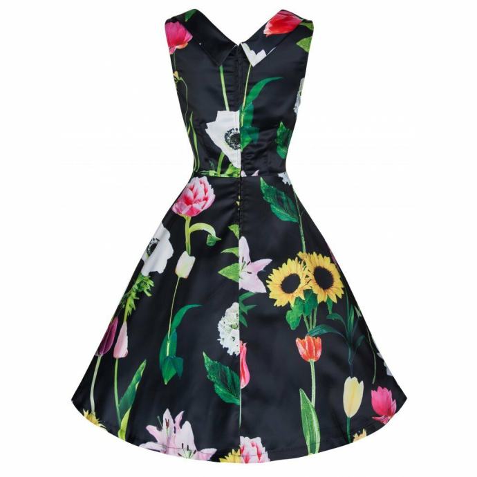 Nova črna obleka s potiskom rož. Zgornji del obleke je podložen s tenko mrežico, spondji ni podložen. Obleka je malenkost raztegljiva, zapenja se zadaj na zadrgo, dolžina je čez koleno..