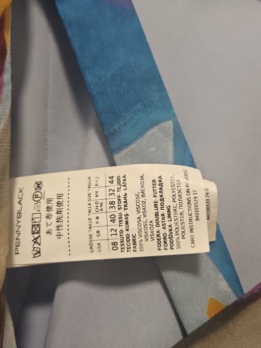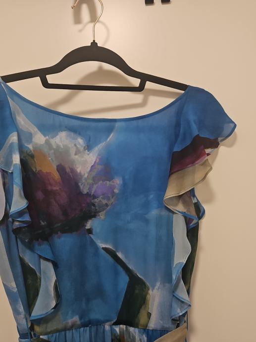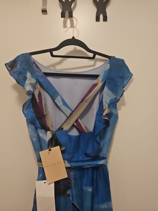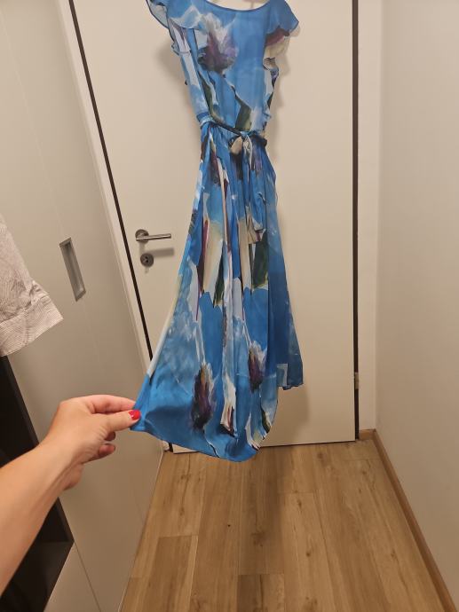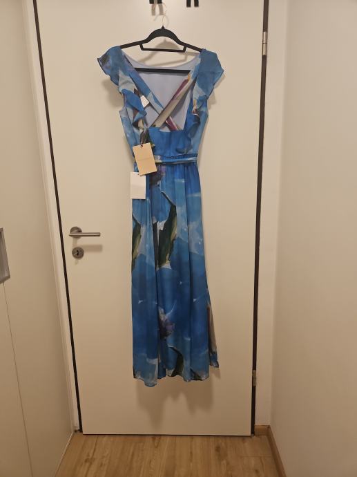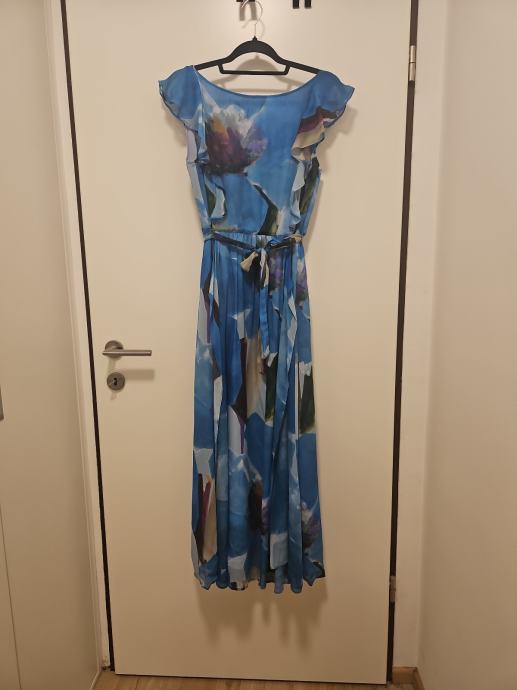 Srednje dolga obleka, zadaj nekoliko odprt hrbet, lepo padajoca, stisnjena v pasu, s trakom za zavezat.