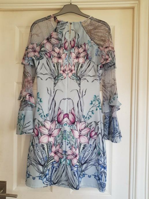 Samo enkrat oblečena svetlo modra Lipsy obleka s cvetličnim potiskom. Obleka ni podložena in ni raztegljiva, zapenja se zadaj na dolgo zadrgo in gumb. Sprednji ramenski del in rokavi so mrežasti, rokavi se zaključijo zvončasto.