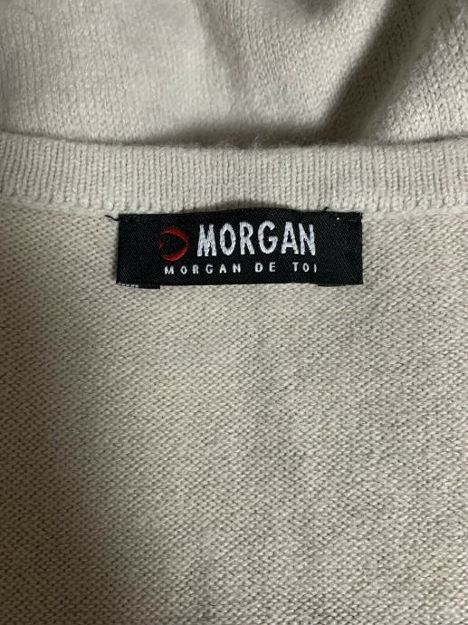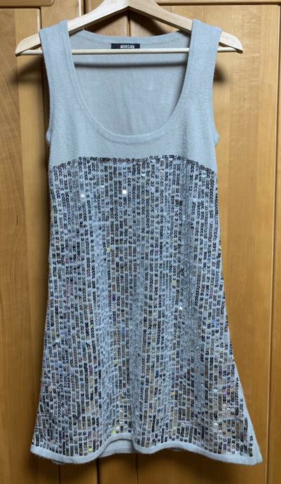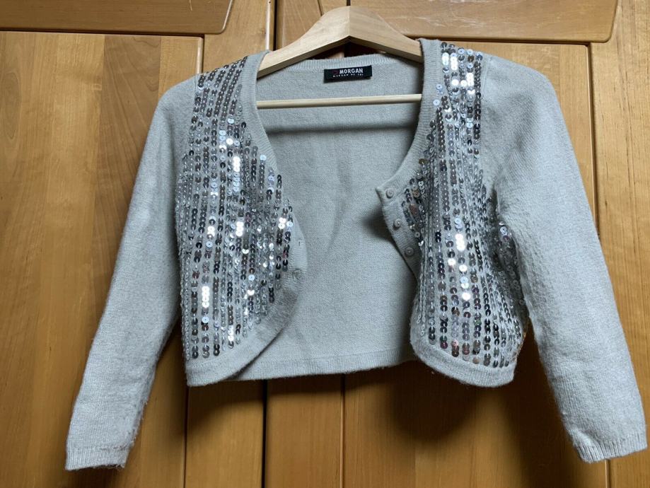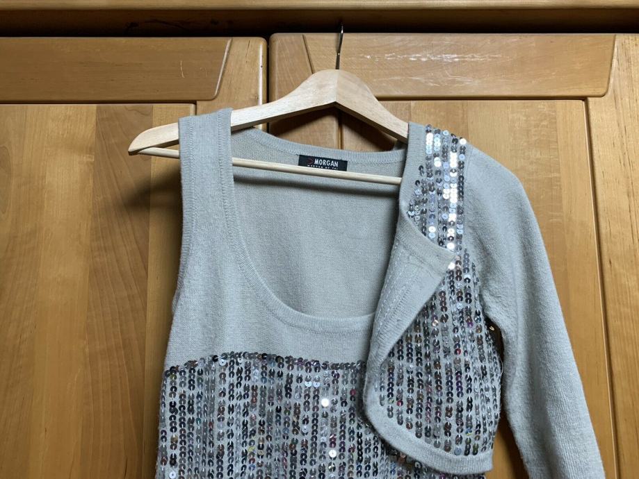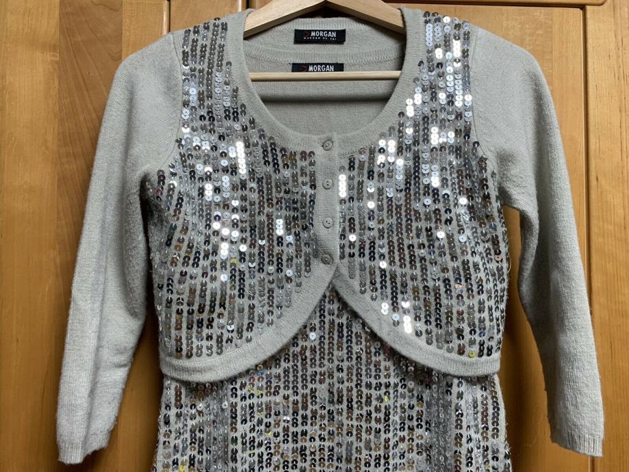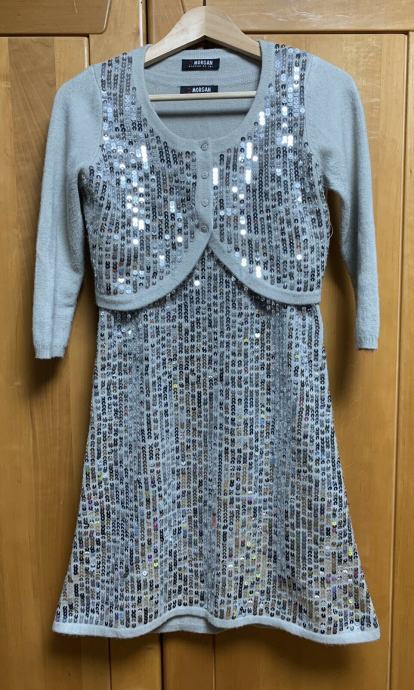 Lepo ohranjen siv pleten komplet obleke in bolera. Ni podložen in je raztegljiv, bolero se zapenja na gumbe, dolžina obleke je do kolen.