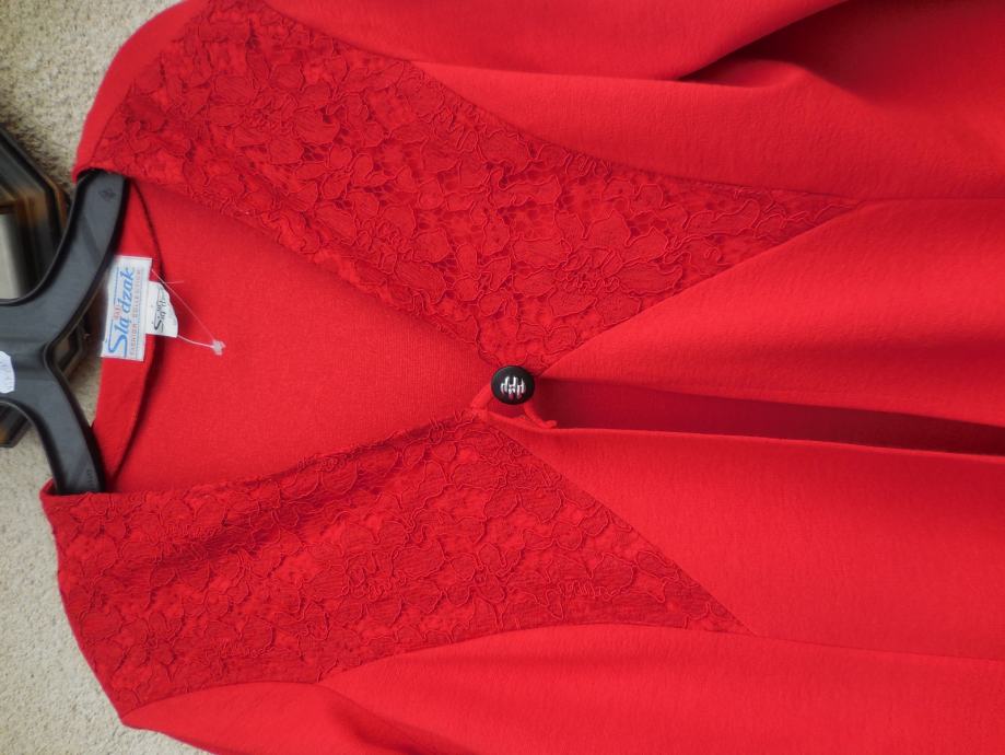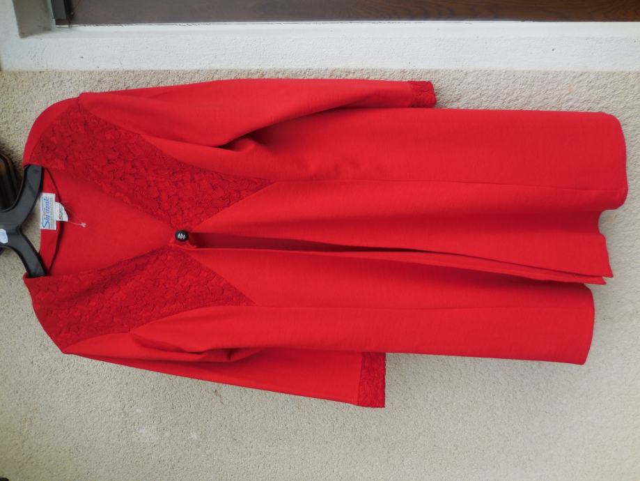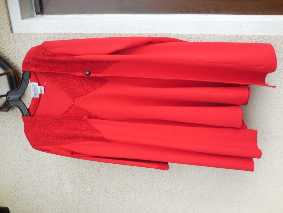 Čudovit nov komplet mini obleke in plašča. Ni podložen in je raztegljiv. Obleka ima na izrezu čipko. Obleka je kratka, plašč je nekoliko daljši. Komplet je primeren za vse tiste, ki imate rade mini obleke in tiste, ki ste nekoliko nižje postave. Originalna oznaka je L, primeren je tudi za M.