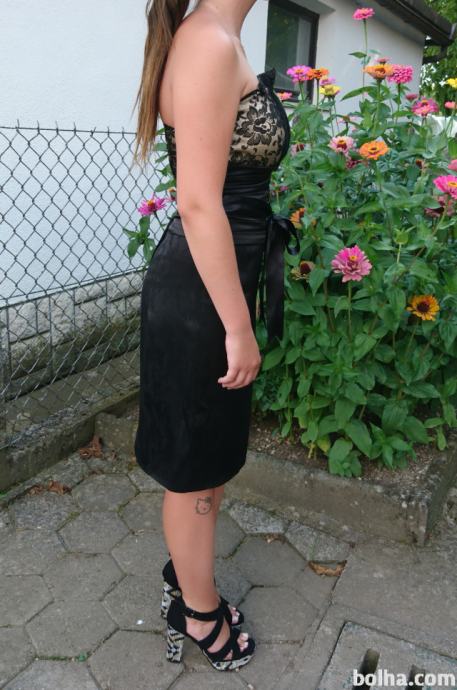 Prodam odlično ohranjeno le enkrat oblečeno elegantno obleko, za posebno priložnost (poroka, maturantski ples, krst, ...). Obleka je velikosti 38, črno-zlate barve, zelo udobna, dolžina obleke je 87 cm, material je 94% poliester in 6% spandex.