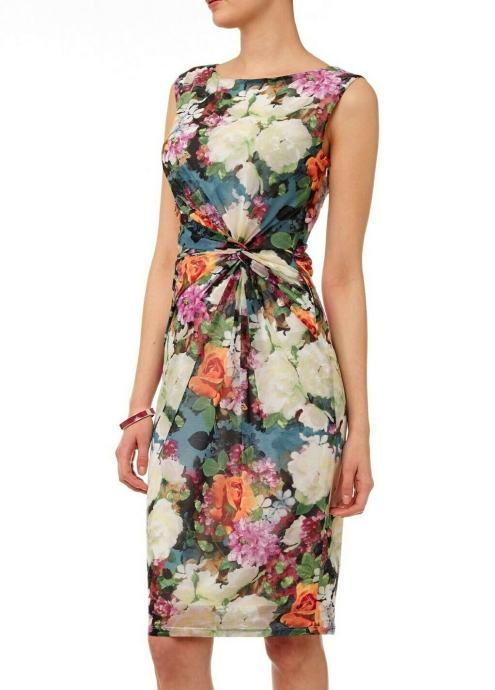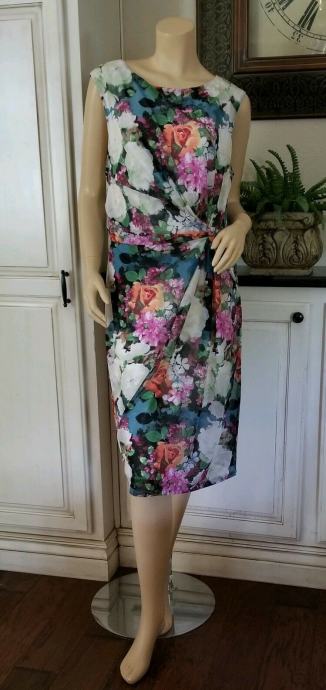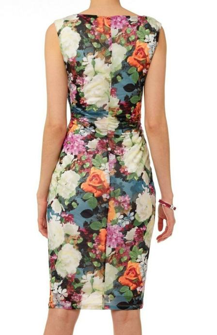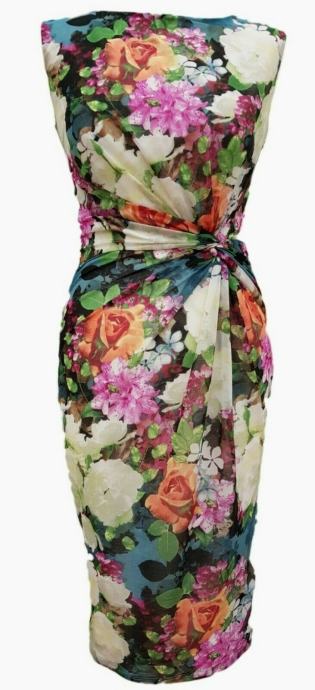 Nova, podložena s tenko podlogo, je raztegljiva, kroj obleke zelo lepo poudari postavo, zapenja se ob strani z zadrgo.