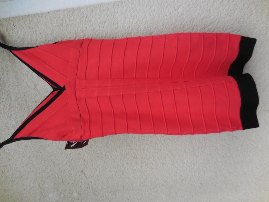 Nova, oprijeta rdeča obleka, ni podložena in je delno raztegljiva.