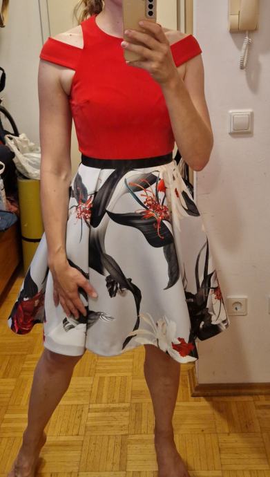 Prodam obleko znamke Coast, v čudoviti rdeče rožasti kombinaciji, ki je nekoliko višjega cenovnega razreda. Spodnji del je dvojno podložen, tako da krilo res lepo stoji. Nosila sem jo enkrat, žal mi je postala preozka. Velikost je Uk 10, kar ustreza 36.
