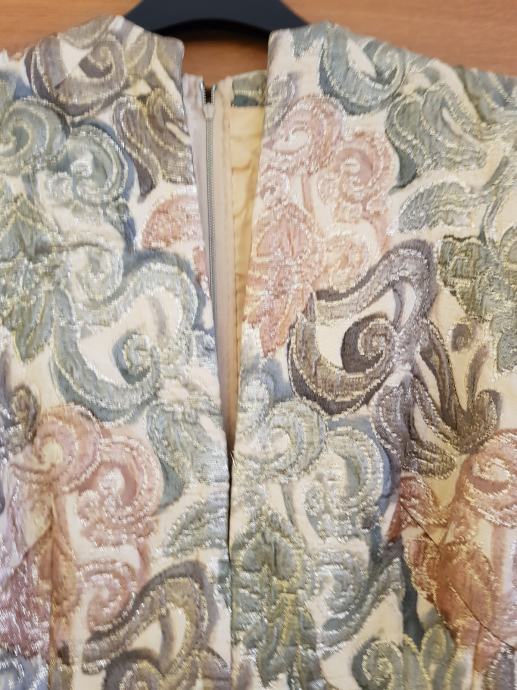 Samo 1x oblečena na poroki, v toplih pastelnih barvah, podložena, ni raztegljiva, zapenja se zadaj z zadrgo
