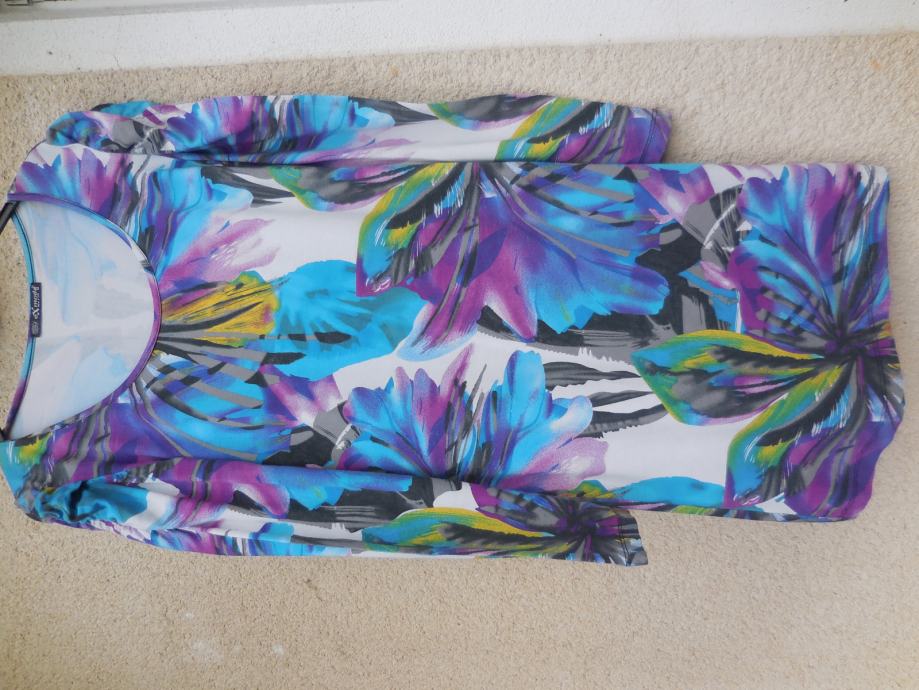 Nošena, vendar še vedno lepo ohranjena prijetno mehka viskoza pomladna obleka v modro vijolčnih odtenkih. Obleka ni podložena in je raztegljiva, dolžina sega nad koleni.