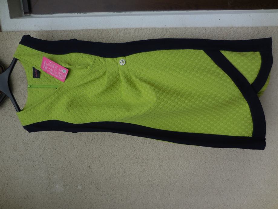 Čudovita zelena obleka z dodatki obrobe v temno modri barvi, ni podložena in ni raztegljiva, zapenja se zadaj na zadrgo, dolžina je do sredine kolen. Originalna oznaka je L, vendar je bolj primerna za M. Originalna cena je bila 69,90€.