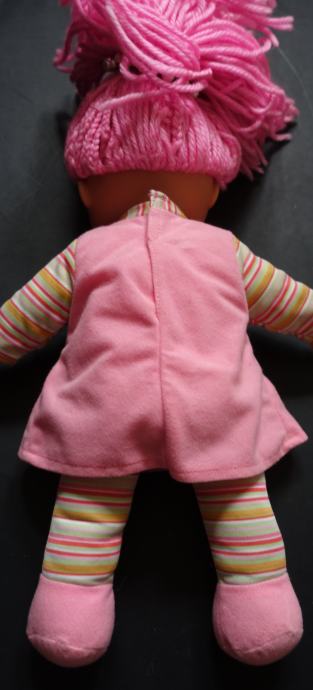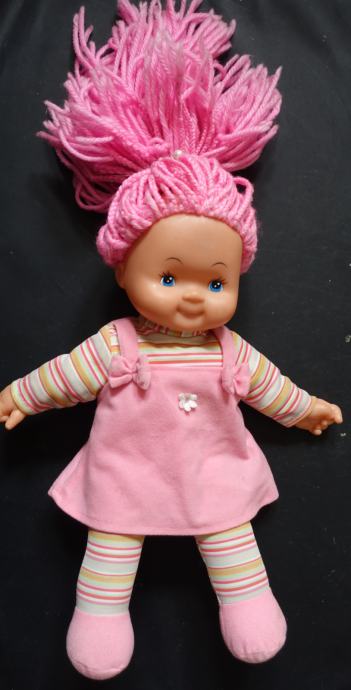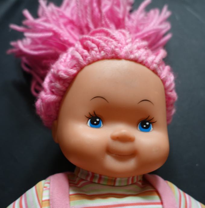 Prisrčna punčka z gumijasto glavo in gumijastimi dlanmi, ostalo je mehko.