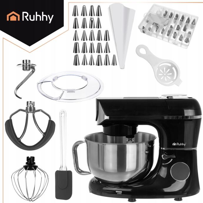 Komplet vsebuje: planetarni mešalnik, skledo, kavelj za testo, metlico, mešalnik, pokrov za skledo, lopatico, ločilo za jajca, vrečko za pecivo s 24 nastavki v organizatorju,