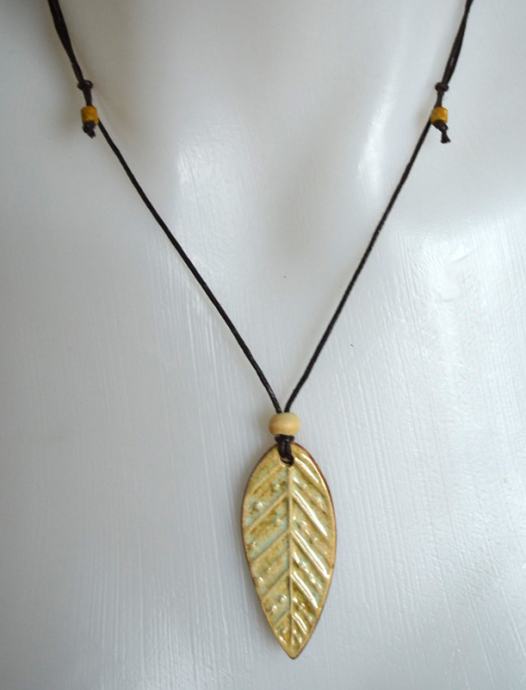 Prodam nerabljen unikatni keramični obesek, motiv listek oz. pero, na vrvici iz povoskanega bombaža z dodatki iz naravnih materialov (les, kost, kamen).