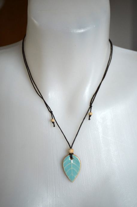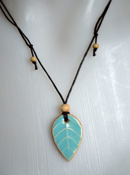 Prodam nerabljen unikatni keramični obesek, motiv listek v svetlo modri barvi, na vrvici iz povoskanega bombaža z dodatki iz naravnih materialov (les, kost, kamen). Ročno delo.