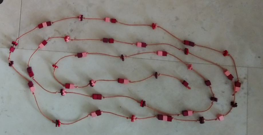 Na roza špagi so nasnute lesene rožice ali kocke v roza ,rdeči in bordo barvi. Dolžina je 1,95 m. Cena je 2 €.