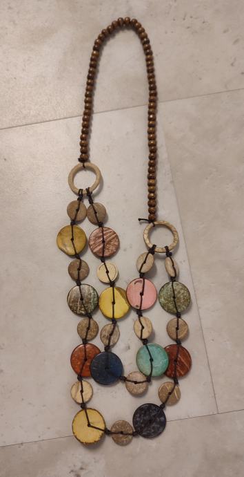 Na verižici je poleg lesenega obeska še 6 večjih lesenih korald. Dolžina verižice 77 cm, dolžina obeska 5,5 cm. Cena je 7 €