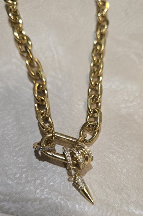 Masivna zlata verižica z obeski (NERJAVEČE jeklo, ZLATA BARVA - barva ostane enaka). Verižica ni nošena in se prodaja izključno zato, ker ne pride na vrsto.