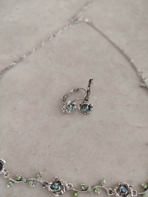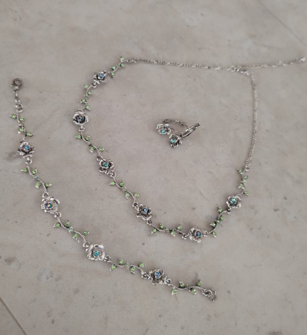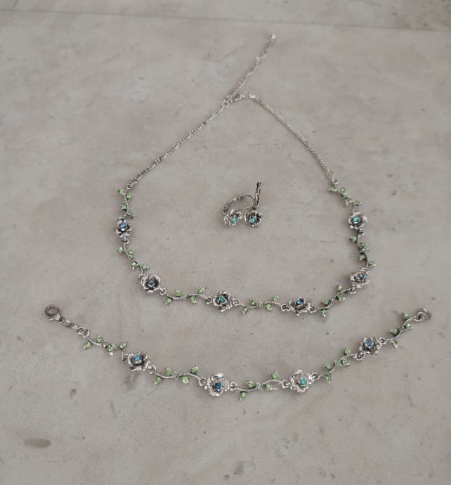 Srebrn komplet rožice( verižica, zapestnica in uhani) z modra in zelenimi kamenčki. Cena 5 € + ptt.