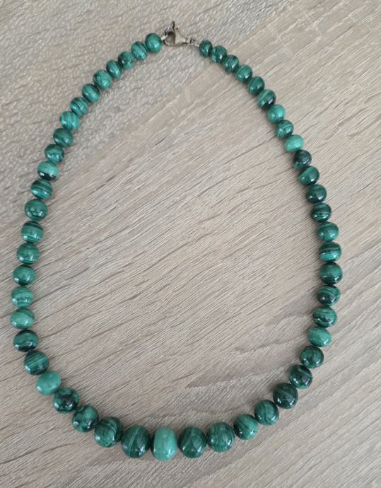 Verižica iz pravega kamna malahit (dolžina 45 cm) in srebro 925. Srebro je majčkeno izgubilo sijaj, kar pa se da z nekaj evri urediti pri zlatarju ali doma s sodo bikarbono. Nakit pa NI nošen.