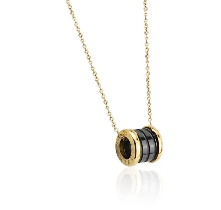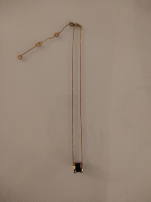 Šrodam verižico. Črn obesek z zlatimrobom, dimenzije 1,2 x 1,6 cm. Dolžina 45 cm.