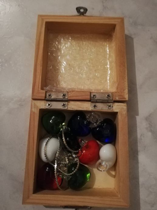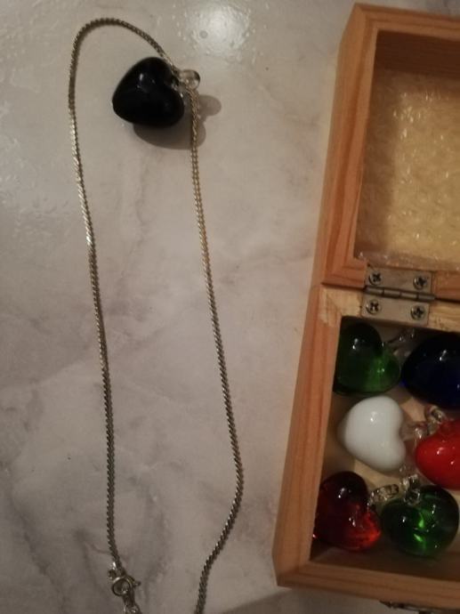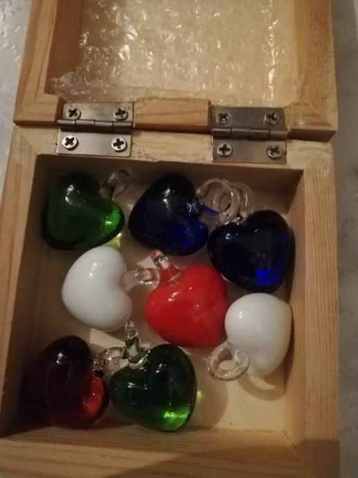 Verižica z devetimi obeski - barvnimi srčki. Srčki so stekleni, dva sta bele mat barve, en je rdeči mat, dva sta prozorno zelen, dva modra en črn in en oranžen ... nešteto kombinacij - lahko je en obesek, ali več ... so v lični leseni škatlici, primerni za darilo, ker je nenošeno.