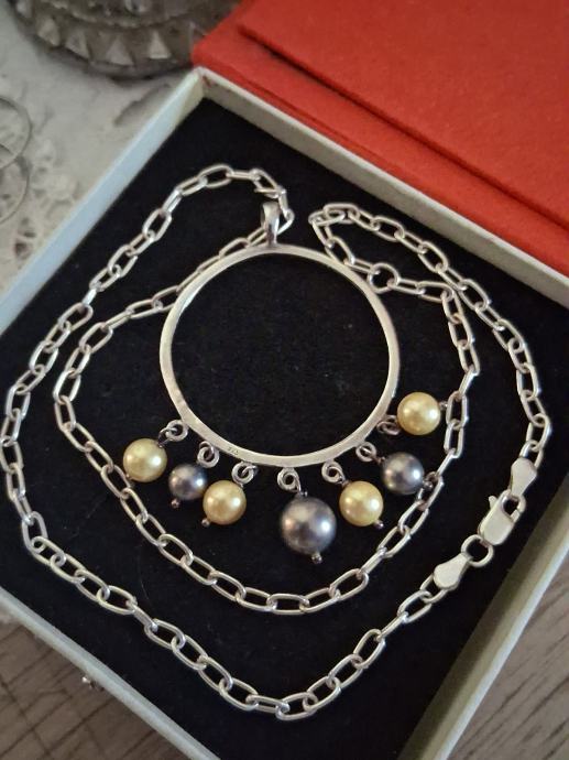 Verižica z obeskom s pisanimi sladkovodnimi biseri iz srebra 925.Dolzina 47 cm.Nenosena!