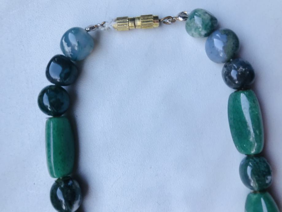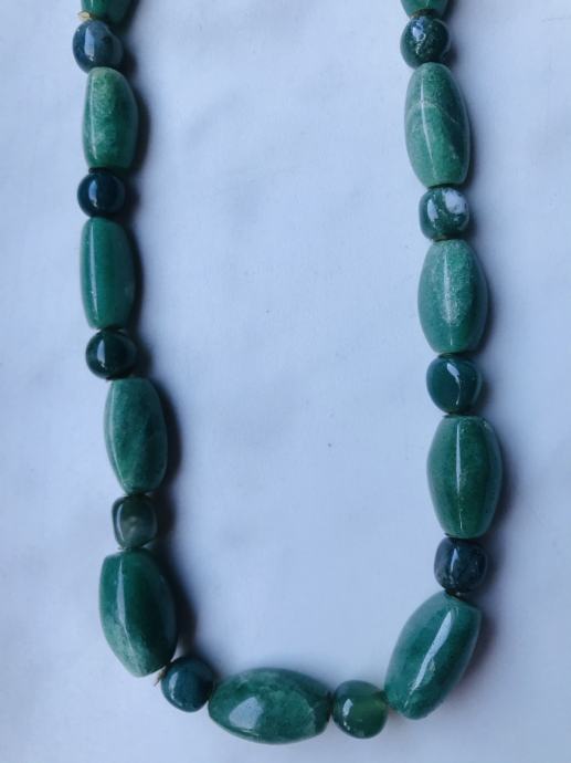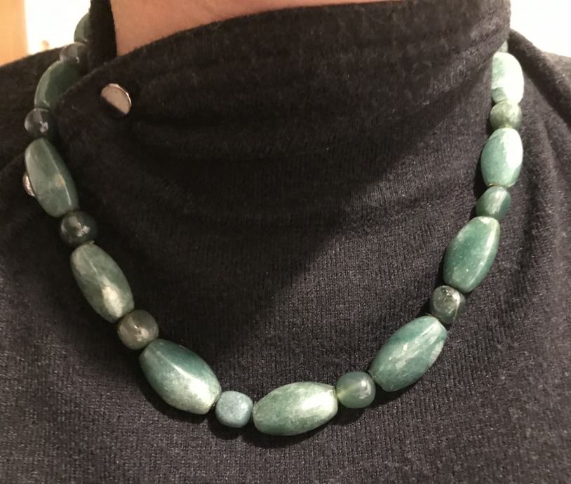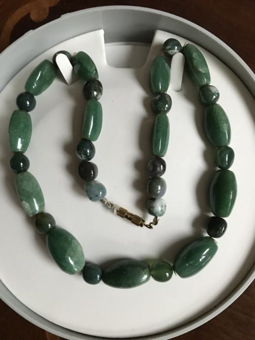 Prodam ogrlico iz lepih zelenih poldragih kamnov. Najverjetneje so mahaliti. Ogrlica je dolga 49 cm, od tega je niz poldragih kamnov dolg 45 cm. Priložim se darilno šatuljo.