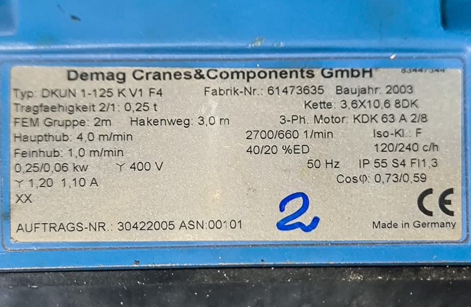 Zelo dobro ohranjeno električno verižno dvigalo Demag DKUN1 250 kg.