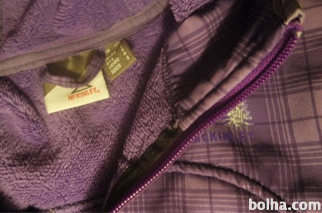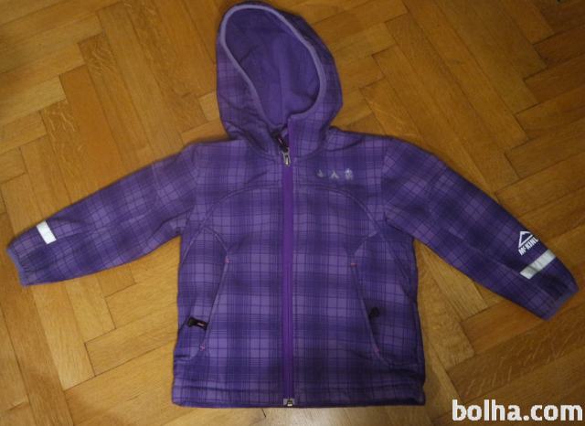 Lepo ohranjena vodoodporna vijolična vetrovka s kapuco za ca. 4-letne deklice, notranja stran podložena s frotirastim blagom, na rokavih našiti odsevniki, ob straneh žepa z zadrgo.