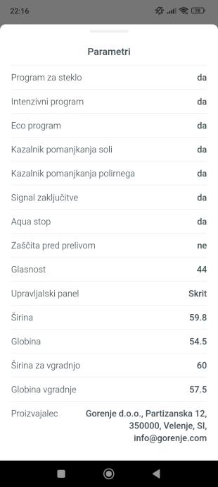 Prodam rabljen vgradni pomivalni stroj Gorenje model GV64324XV v odličnem in normalno delujočem stanju.Stroj ima številne uporabne funkcije kot so eco program, program za steklo in intenzivni program. Vključuje tudi kazalnik pomanjkanja soli in sredstva za izpiranje ter funkcijo aqua stop.