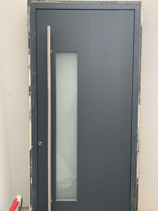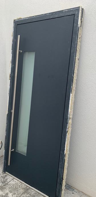 Prodamo malo rabljena Alu vhodna vrata v antracit barvi z mlečnim steklom za prehod svetlobe
