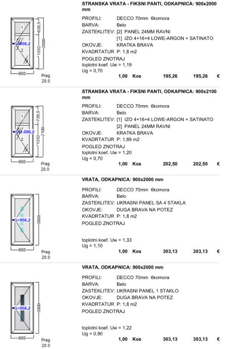 Balkonska vrata enokrilna, 6 komora, dvojno tesnenje, izo 4-16-4 Lowe-argon steklo - 1,3W/m2K OZ