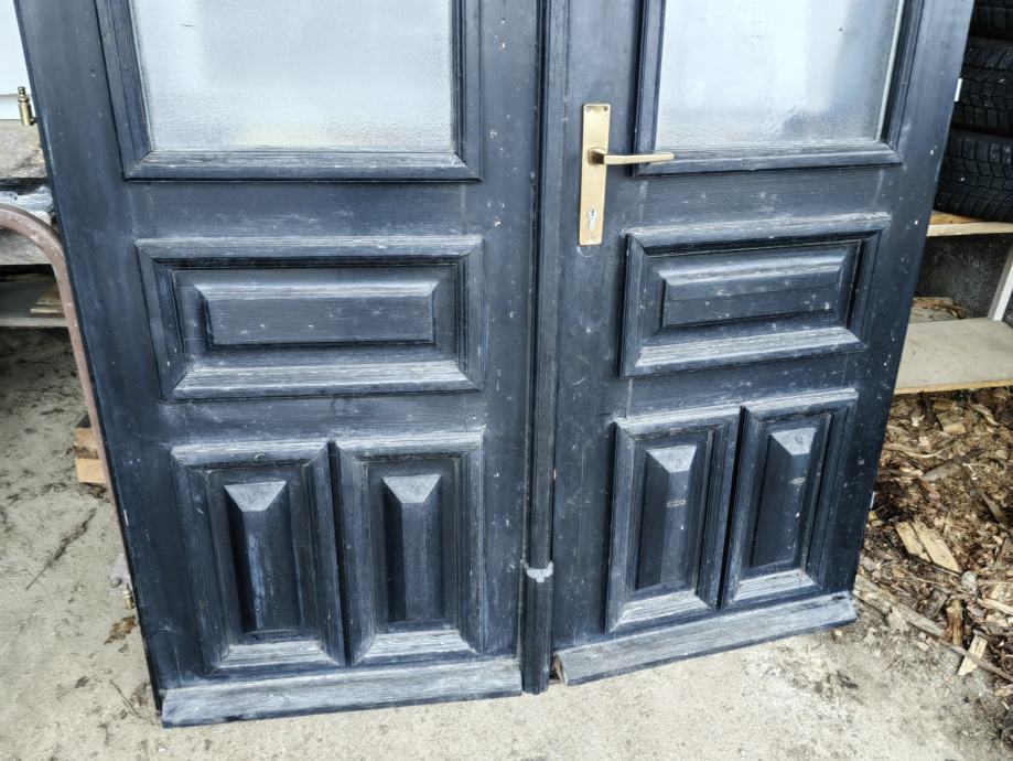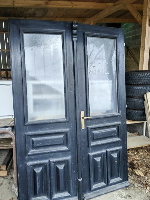 Dvokrilna vhodna vrata, macesen, starinski izgled , cele in napoškodovana, steklo termopan, brez podboja, cena 70€.