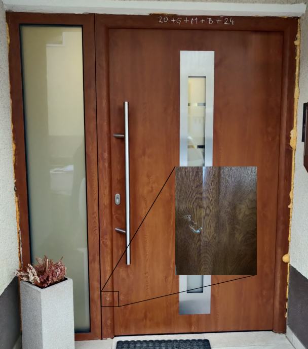 Zunaj in notraj imitacija hrasta, desno odpiranje na noter, tri-točkovno zaklepanje, proti-vlomni panti, zunaj inox ročaj 80cm, stara cca 9 let.