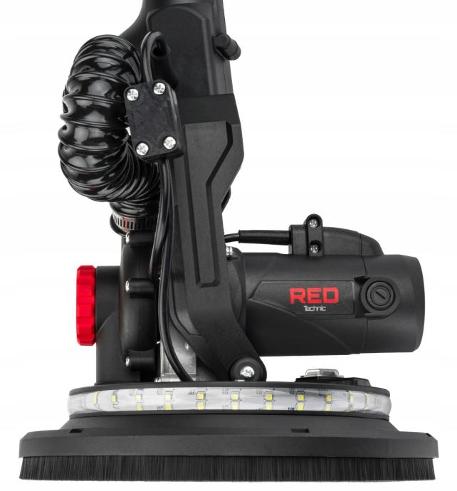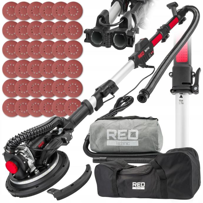 Brezprašni brusilnik z dolgim dosegom tipa GIRAFFE znamke RED TECHNIC, model RTSDG0019. Naprava je odlična za brušenje mavčnih ometov na stenah, stropih in višjih površinah.