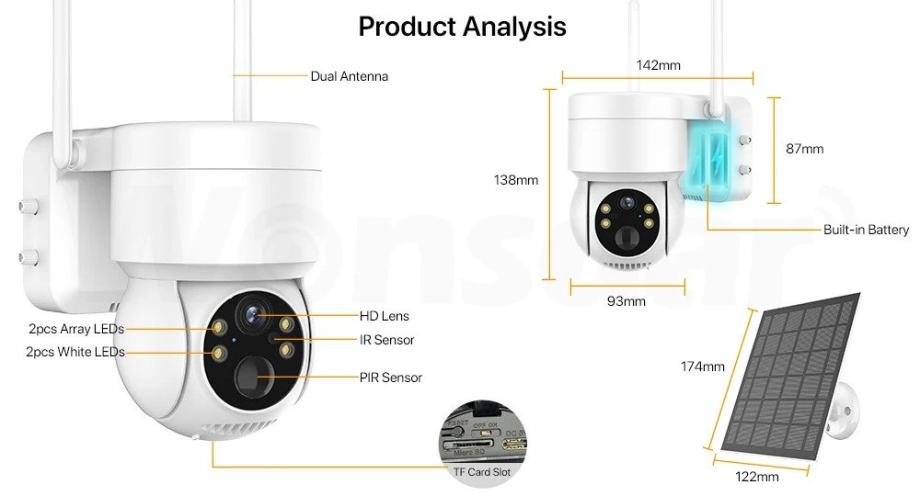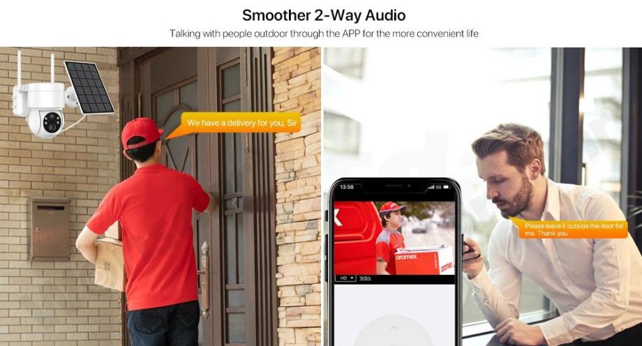 Vrhunska vodotesna, vrtljiva, solarna ip wifi kamera 4MP, snema v ločljivosti full hd 1080p. Deluje na vgrajene litijeve baterije, katere se polnijo preko sončnega kolektorja montiranega zraven kamere. Kamera zato neprekinjeno deluje ves čas. Kamera podpira sd kartice do 128G. Kamera je vodotesna. Vgrajen ima tudi mikrofon in zvočnik. Priložena podrobna slovenska navodilo o nastavitvah in namestitvi, garancija.