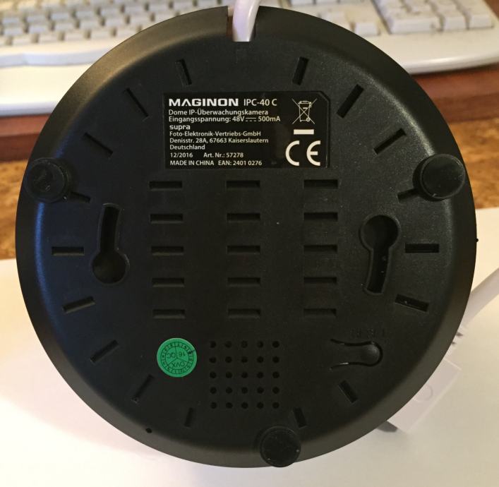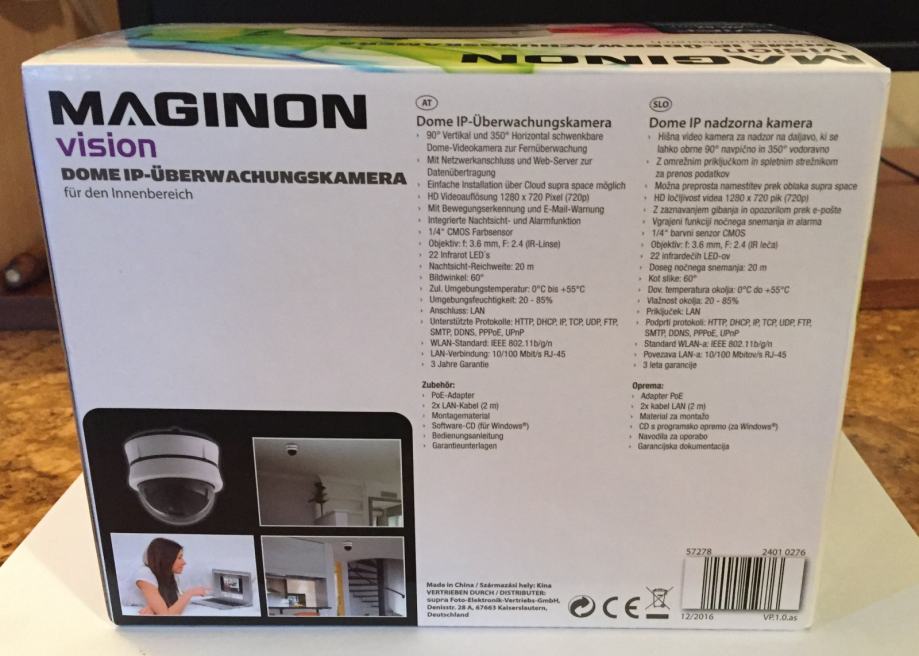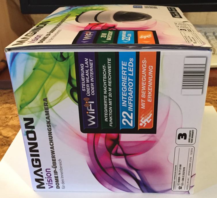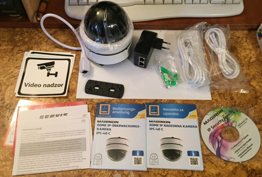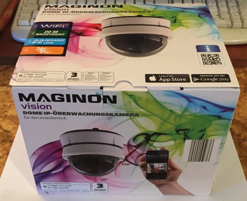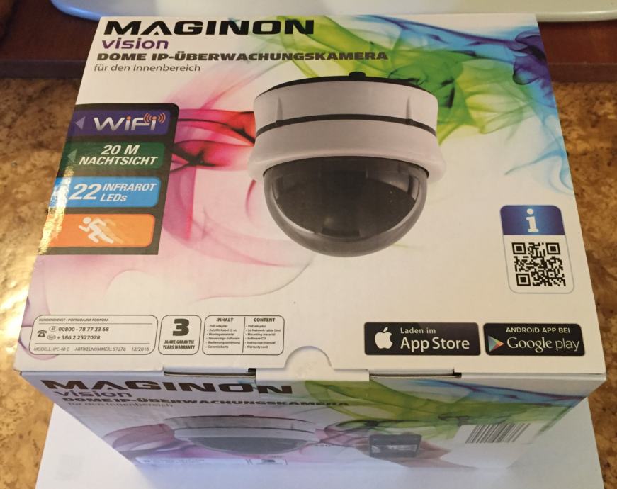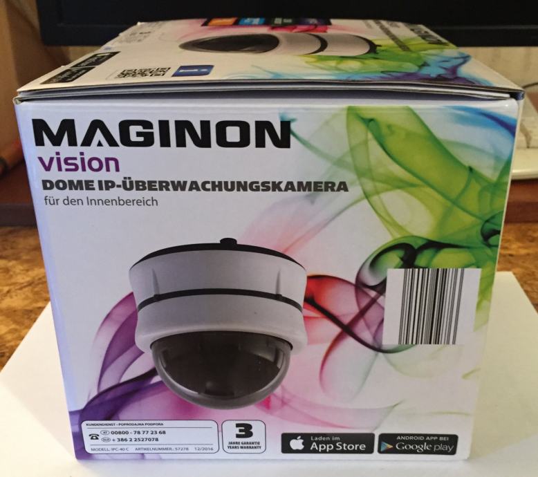 Prodam vrtljivo Wi-Fi dome nadzorno varnostno IP kamero Maginon IPC-40 C primerno za notranje oziroma pokrite prostore. Povezava z IP omrežjem preko žice ali brezžično (WiFi). Napajanje preko priloženega POE adapterja (po eni žici do kamere gre napajanje in podatki / video).
