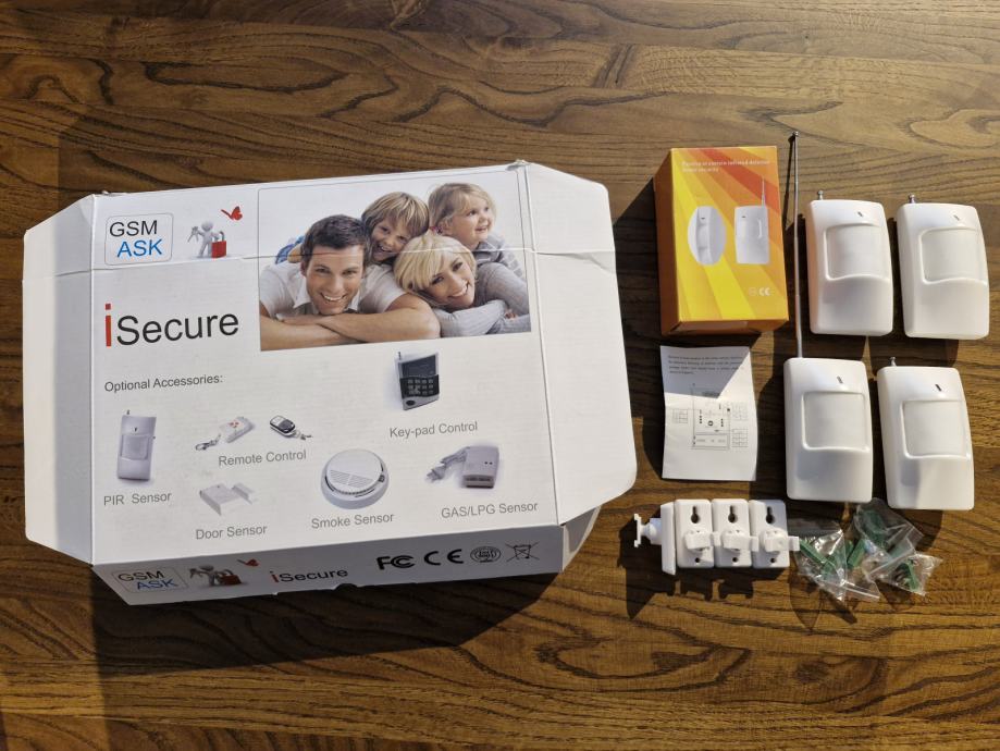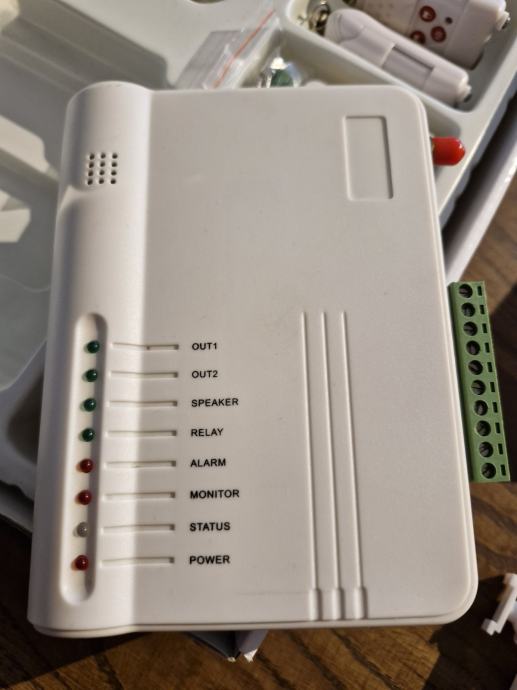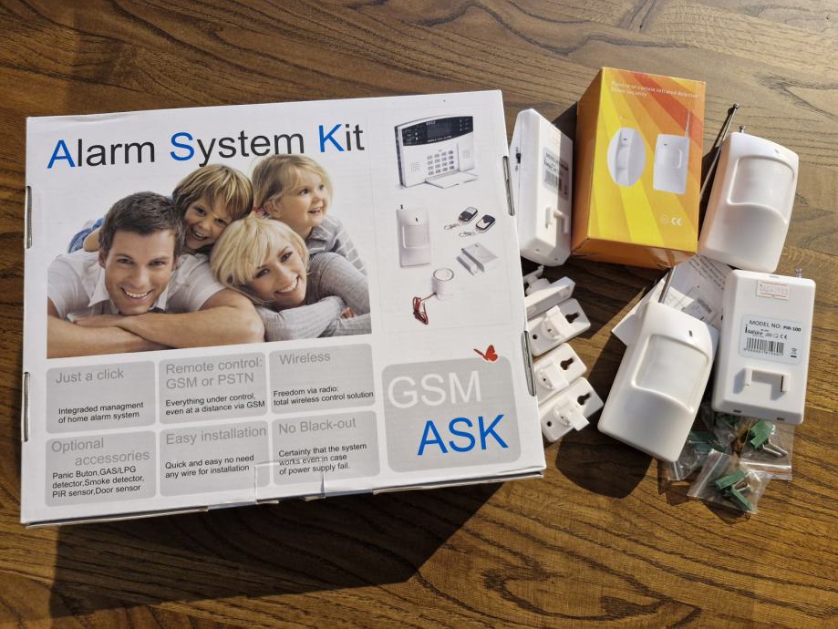 Komplet alarmna naprava z GSM vmesnikom na SIM kartico, sestavljena iz centralne enote, relejnega izhoda, PIR senzorja gibanja, magnetnega senzorja za vrata oz. okna, treh daljinskih upravljalnikov, notranje sirene in dodatno 5 PIR senzorjev gibanja.