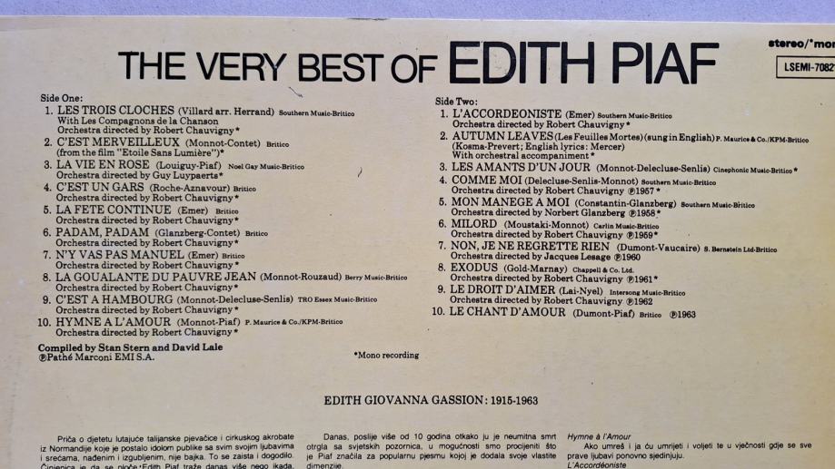 Prodam LP ploščo »The very best od Edith Piaf«, na kateri je 20 skladb priljubljene francoske pevke šansonov. Seznam vseh skladb je razviden na fotografiji. Plošča je brez napak. Cena LP je 15 eur, v primeru da želite dostavo po pošti se doda še 4 eur poštnine.