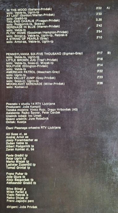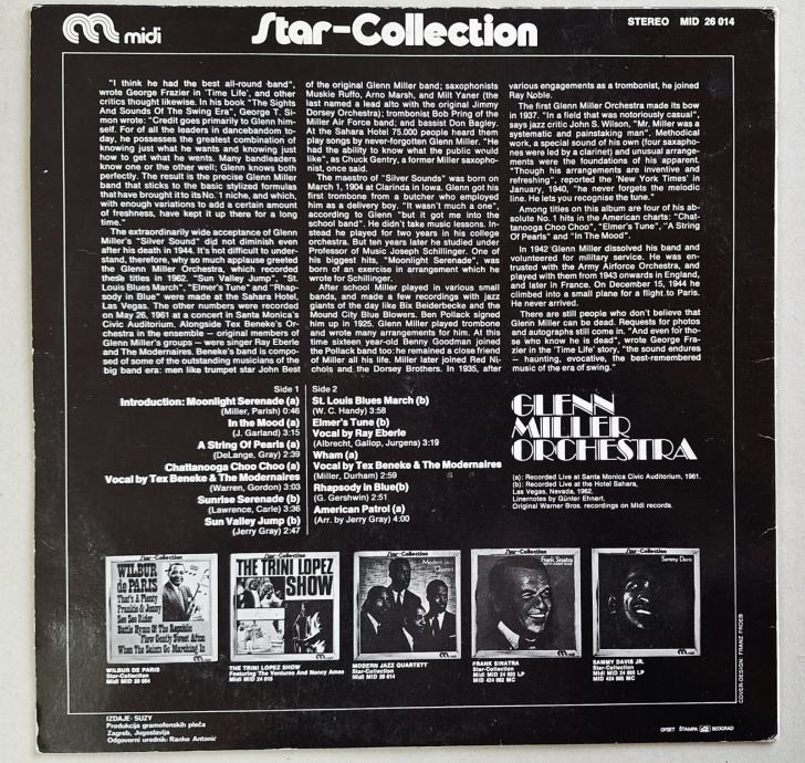 Prodam ploščo ameriškega »Glenn Miller Orchestra« na kateri je 11 skladb tega nekdaj zelo popularnega orkestra. Seznam vseh skladb je razviden na fotografiji. Plošča je brez napak. Cena LP je 15 eur, v primeru da želite dostavo po pošti se doda še 4 eur poštnine. Prodam tudi LP ploščo s skladbami Glenna Millerja, v priredbi Plesnega orkestra RTV Ljubljana, pod vodstvom dirigenta Jožeta Privška. Več podatkov je na fotografiji. Cena 15 eur. Info 041 643 431.