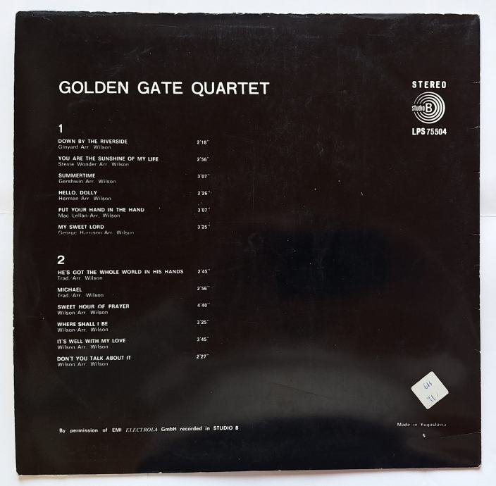 Prodam LP ploščo enega najuspešnejših ameriških izvajalcev črnskih duhovnih pesmi - vokalnega ansambla »Golden Gate Quartet«. Na plošči je 12 njihovih najbolj znanih skladb. Celoten seznam je razviden na fotografijah. Plošča je brez napak. Cena je 15 eur, v primeru da želite dostavo po pošti se doda še 4 eur poštnine. Info 041 643 431.