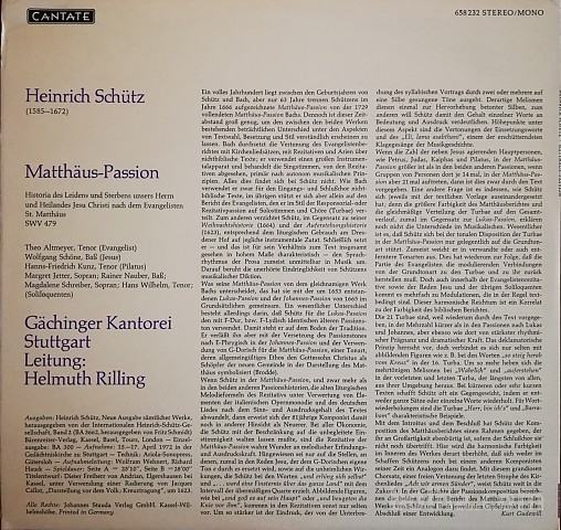 Theo Altmeyer, Tenor (Evangelist) Wolfgang Schöne, Baß (Jesus) Hanns-Friedrich Kunz, Tenor (Pilatus) Margret Jetter, Sopran;Rainer Nauber, Baß;Magdalene Schreiber, Sopran;Hans Wilhelm, Tenor;(Soliloquenten) Gächinger Kantorei dn a Stuttgart Leitung: Helmuth Rilling ton ve Er ver nach E dung v deren Schöpf thäus s Wenn in den Melod menter Liedes abwan Ausgaben: Heinrich Schütz, NeueAusgabe Heinrich Schütz Ein vo Schüta Jahre (1585-1672) vollen abstar besteh von T lassen richtes nichtb talapp Matthäus-Passion Historia des Leidens und Sterbens unsers Herrn und Heilandes Jesu Christi nach dem Evangelisten St. Matthäus SWV 479 tiven zipien verwe biblisc Bericht Rezita teilt.Z Weihn (1623) Theo Altmeyer, Tenor (Evangelist) Wolfgang Schöne, Baß (Jesus) Hanns-Friedrich Kunz, Tenor (Pilatus) Margret Jetter, Sopran;Rainer Nauber, Baß;Magdalene Schreiber, Sopran;Hans Wilhelm, Tenor;(Soliloquenten) ener er- gesehe rhythn Daraul musik Was s Bachs denen Grund besteh Gächinger Kantorei dn a Stuttgart Leitung: Helmuth Rilling.